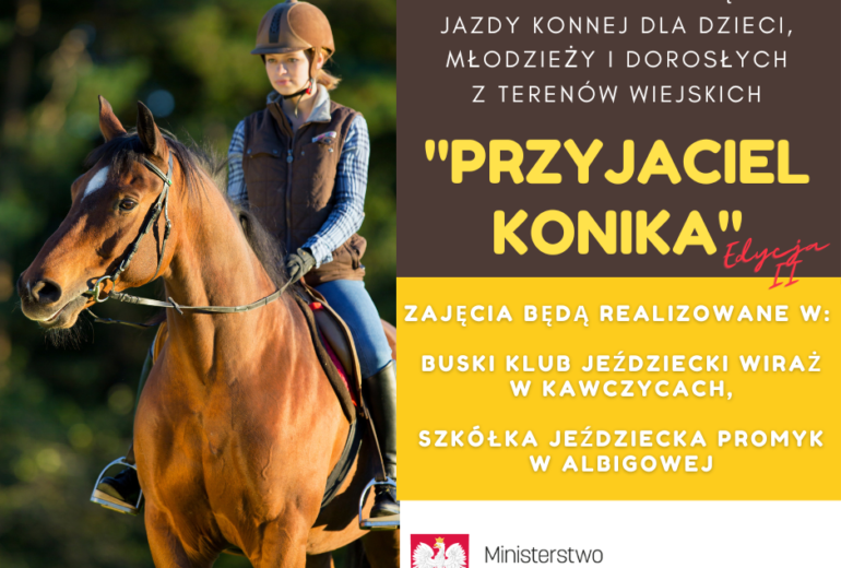 ZAPRASZAMY NA BEZPŁATNE TRENINGI JEŹDZIECKIE W RAMACH PROJEKTU „JEŹDZIECTWO BEZ BARIER” Termin realizacji projektu: – I. okres od 2024-01-01 do 2025-03 ...