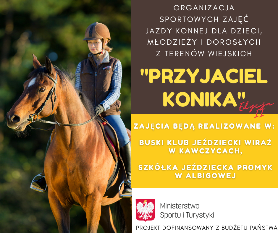 Projekt realizuje Buski Klub Jeździecki WIRAŻ dzięki dofinansowaniu z Budżetu Państwa – Ministerstwa Sportu i Turystyki
